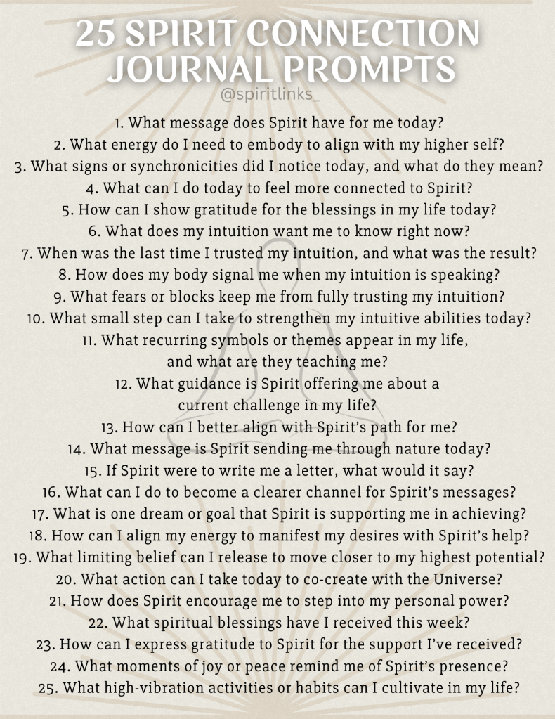 As you journal, you’ll find that Spirit’s messages become clearer, your intuition grows stronger, and your trust in the unseen deepens. This is your sacred dialogue, a co-creation with the universe.