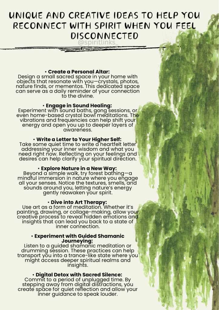 When your connection feels distant, it can help to reflect on why you seek Spirit in the first place. What drew you to your practice? What moments made you feel truly connected in the past? Sometimes, we go through the motions of spirituality without realizing we’ve outgrown certain practices or need a fresh perspective. Journaling about your spiritual journey can bring clarity and rekindle your connection.